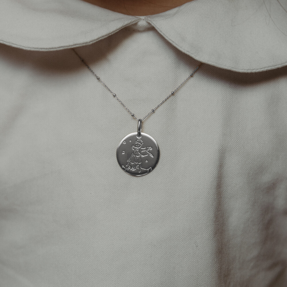 Voir la description complèteMédaille ou bijou à offrir à un ou une passionné(e) de littérature, ce délicat et magnifique médaillon est un cadeau chargé de sens. En effet, Le Petit Prince était, pour Saint-Exupéry en 1943, une allégorie de la nécessité d’être toujours en action pour ne pas se perdre dans l’immobilisme. Dans un appel salutaire à toujours se remettre en question, le Petit Prince nous invite sur cette médaille de baptême à embrasser cette élévation spirituelle par sa posture : bras grand ouvert, il nous accueille tout en accueillant le monde et le futur. Le style sobre et minimaliste du dessin plaira aux petits comme aux grands. Cette médaille moderne et unique est en or blanc. Cette médaille est brillante au recto et brossée au verso. Modèle déposé.