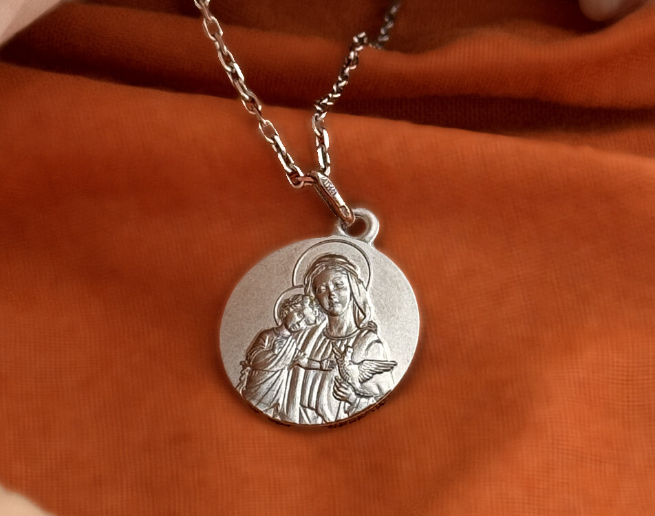 415 €Sur cette médaille de baptême la Vierge auréolée est représentée la tête légèrement inclinée vers la droite, le visage empreint d’une tendresse maternelle teintée d’une mélancolie méditative.