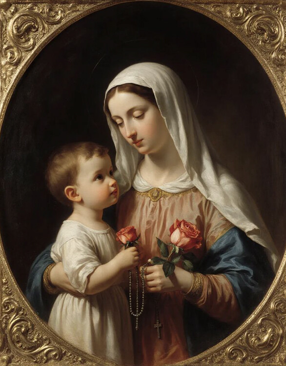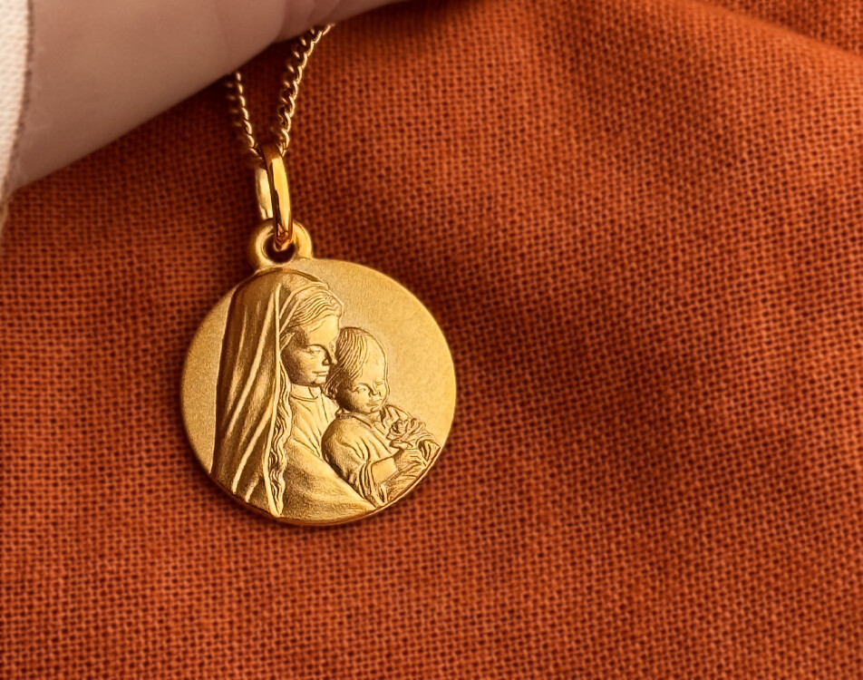 La médaille Vierge à l’Enfant à la Rose symbolise l’amour maternel et la douceur de l’enfance.