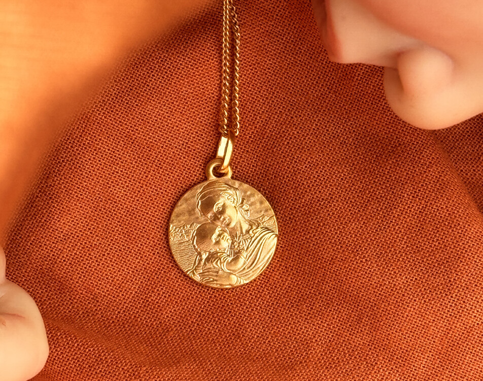 La médaille Vierge à l’Enfant au Rameau incarne la tendresse maternelle et la protection divine.