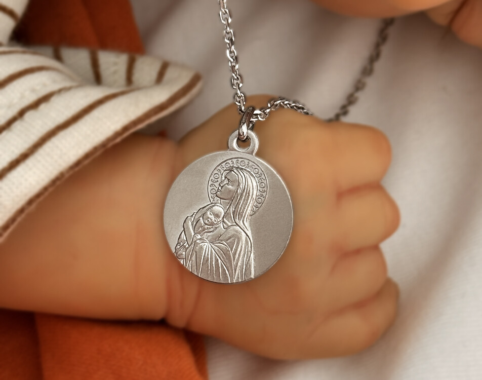 La médaille Vierge Mère du Créateur reflète la douceur et la grâce de Marie tenant l’Enfant.