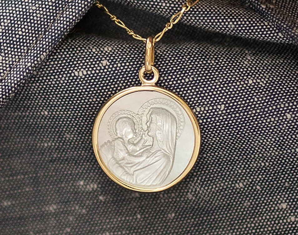 Cette médaille de baptême Vierge à l’enfant douceur en nacre est empreinte d’une délicate grâce.