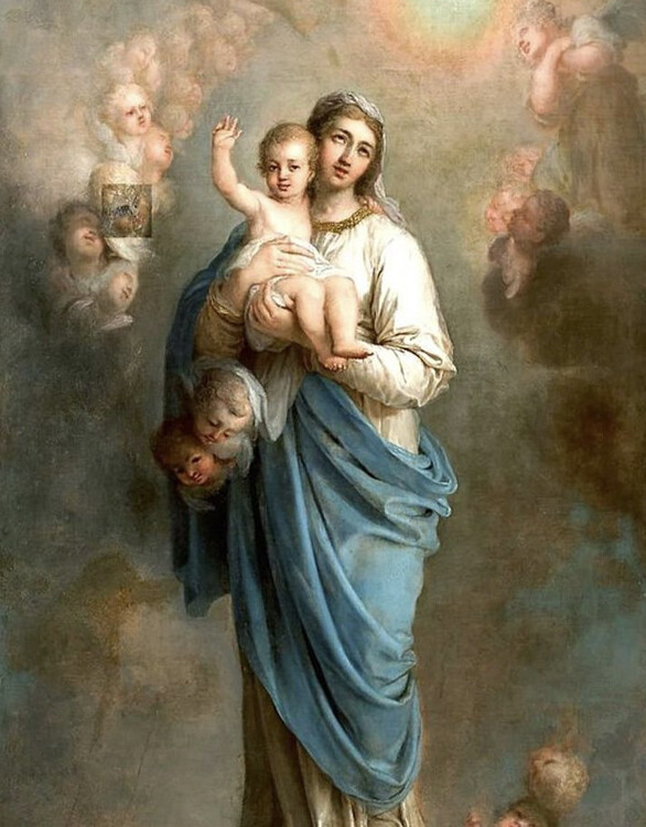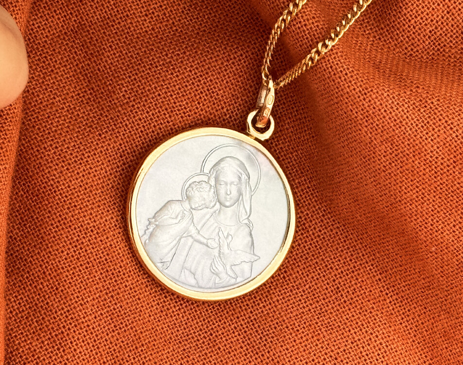 Médaille Vierge à l'enfant et la colombe - Or jaune 18ct & nacre