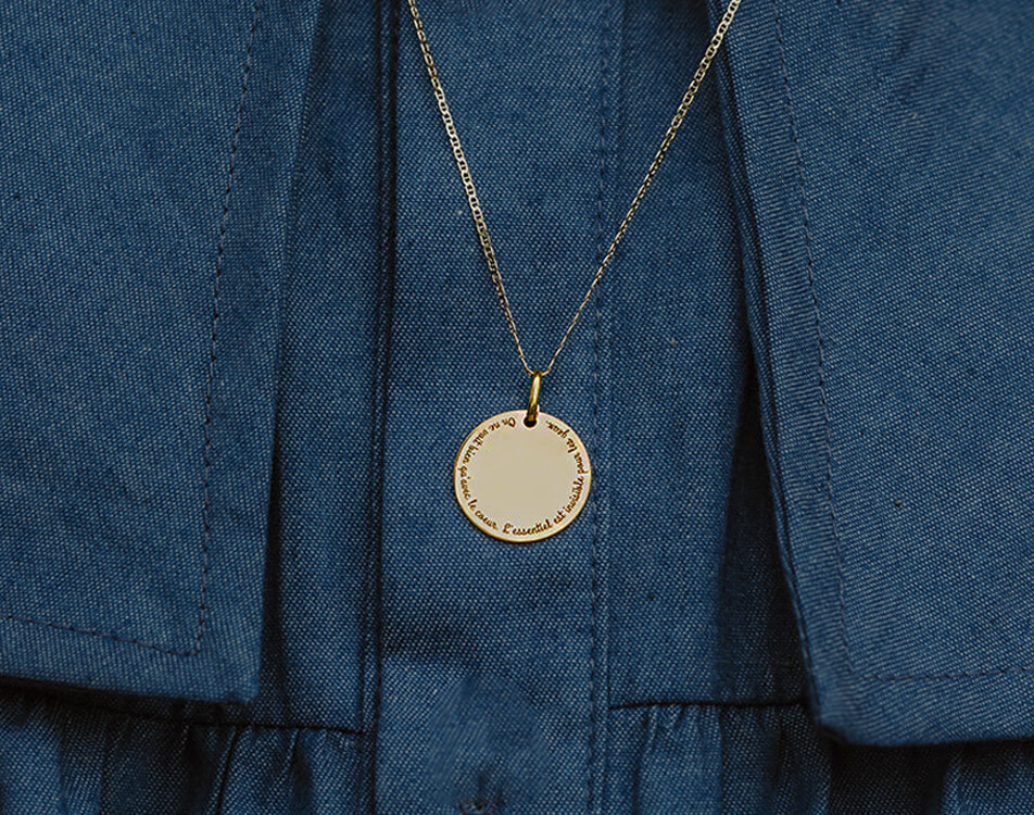 269 €La Maison de la Médaille vous propose ici un médaillon en or jaune 18 carats qui comporte la citation suivante : "On ne voit bien qu'avec le cœur. L'essentiel est invisible pour les yeux."
