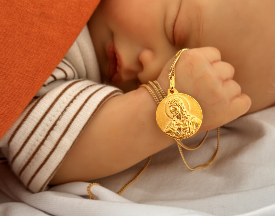 Les parents demandent le plus souvent à la marraine et au parrain une médaille religieuse, c'est la tradition pour un baptême catholique à l'Eglise.