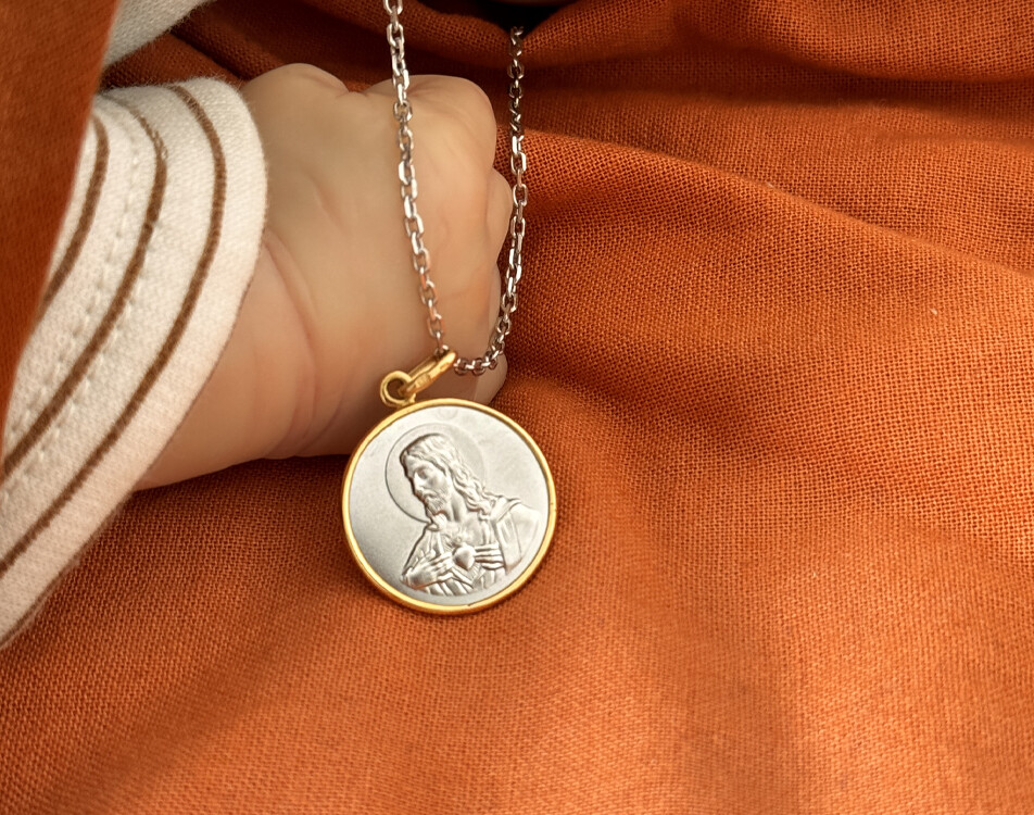 419 €Cette médaille religieuse recto verso en finition bicolore sublime deux représentations majeures de la foi chrétienne : Notre-Dame du Mont-Carmel tenant l’Enfant Jésus d’un côté, et le Sacré-Cœur de Jésus...