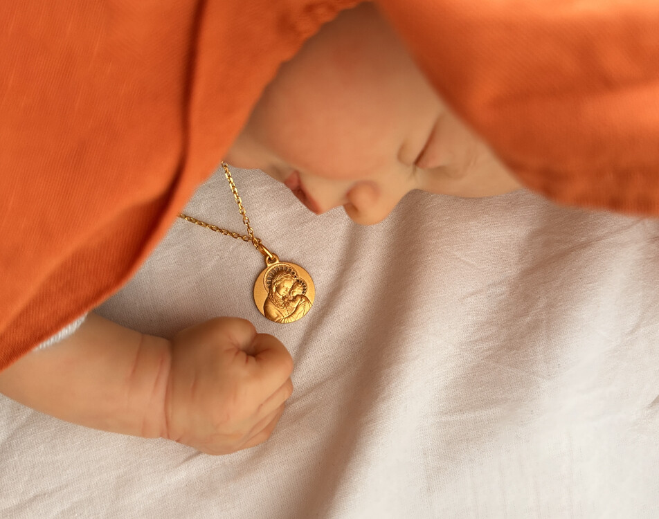 Comme l'Enfant Jésus dans les bras de la Vierge, cette médaille devient un symbole tangible de sécurité et de foi, offrant une présence réconfortante tout au long de sa vie, sous le regard maternel de Marie.